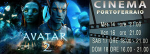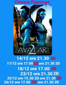 Al Cinema “Flamingo” di Capoliveri, “Avatar 2” sarà proiettato in 2D sabato 17 e venerdì 23 alle ore 21:30, domenica 25 alle ore 15:30, lunedì 26 alle ore 21:30, venerdì 30 alle ore 17 e domenica 1 gennaio alle ore 15. Il film sarà proiettato anche in 3D nelle giornate di domani, mercoledì 14 dicembre, alle ore 21:30, sabato 17 e domenica 18 alle ore 17, domenica 25 alle ore 21:30, lunedì 26 e martedì 27 alle ore 17, mercoledì 28 dicembre e domenica 1 gennaio alle ore 21:30.