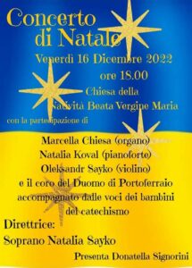 gIl programma delle celebrazioni in vista delle prossime festività, predisposto dalla parrocchia della Natività della Beata Vergine Maria (Duomo), inizia con venerdì 16 novembre. Alle 17 celebrazione della santa messa; alle 17,30 la Novena di Natale. Alle 18 Concerto di Natale. L’evento si svolgerà con la partecipazione di Marcella Chiesa (all’organo), Natalia Koval (al pianoforte), Oleksandr Sayko (violino) e il coro del Duomo di Portoferraio accompagnato dalle voci dei bambini del catechismo diretti dalla soprano Natalia Sayko. Il concerto sarà presentato da Donatella Signorini. Sabato 17 dicembre: alle 18, santa messa. Alle 19 concerto di pianoforte. Domenica 18 dicembre, Giornata della Caritas d’Avvento. Ore 11 santa messa e benedizione dei presepi. Alle 17,30 concerto. Mercoledì 21 dicembre alle 21 liturgia penitenziale (confessioni). Venerdì 23 dicembre alle 15,30 sua eccellenza monsignor vescovo Carlo Ciattini incontrerà i rappresentanti delle varie attività parrocchiali per i saluti alla comunità elbana. Alle 16, santa messa. Sabato 24 dicembre, alle 23 santa messa solenne della Natività del Signore accompagnata dalle voci del coro del Duomo. Domenica 25 dicembre, Natale del Signore, alle 11 santa messa accompagnata dai canti dei bambini del catechismo; alle 18 santa messa solenne accompagnata dalle voci del coro del Duomo. Lunedì 28 dicembre, Santo Stefano, alle 11 santa messa.