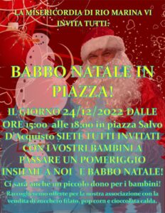 A partire dalle 15, e fino alle 18, Babbo Natale consegnerà dei piccoli doni a tutti i bambini, con l’aiuto dei volontari della Misericordia di Rio Marina.