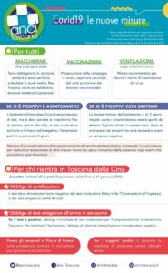 Fino al 31 gennaio, invece, per chi rientra in Toscana dalla Cina, sarà obbligatoria la certificazione dell’esito negativo del tampone molecolare, effettuato nelle 72 ore precedenti l’ingresso in regione, o del test antigenico, effettuato nelle 48 precedenti. Presso gli aeroporti di Pisa e di Firenze sono state attivate le postazioni per effettuare tamponi e gestire eventuali positivi. Per i soggetti positivi è garantita la possibilità di isolamento presso alberghi sanitari.
