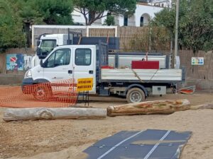 Come già annunciato nel precedente articolo, la ditta appaltatrice dei lavori di realizzazione della strada provvisoria sulla spiaggia di Lido a servizio del dissalatore di Mola, approfittando del cambio di vento e del calare dell’intensità delle onde, ha cercato di metter in salvo le parti delle strutture che il mare stava trascinando con sè.