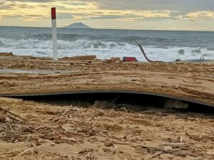 Una ruspa è intervenuta per raccogliere le strisce più in pericolo e trasportarle in una zona dove non possano essere insidiate dalle onde, in attesa di poter iniziare i lavori di ripristino.