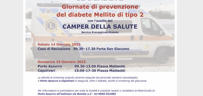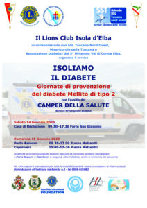 Il Lions Club Isola d’Elba, in collaborazione con ASL Toscana Nord Ovest, Misericordie della Toscana, Associazione Diabetici del 3° Millennio Val di Cornia Elba, organizza il service ISOLIAMO IL DIABETE, con l’Ausilio del CAMPER DELLA SALUTE inviato dal Distretto Lions 108LA Toscana, secondo il seguente programma: