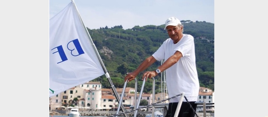 Nella foto Luciano Niccolai in barca con sullo sfondo Marciana Marina