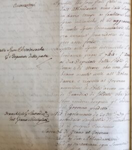 Susseguentemente una simil grazia è stata in diversi tempi accordata di sacca 24 al Camarlingo,24 all’Auditore ,24 al maggiore di Piazza sicchè questa grazia dell’introduzione del grano estesa a tutti i sopradescritti ministri valutata secondo il regolamento del 1742 produce l’annua spesa di lire 1423 aggravio che a poco a poco è divenuto maggiore e che può dirsi ancora ( ) mentre l’abbondanza nella farina e pane che vende ora ai sopradetti privilegiati non puole nei tempi ancora i più fortunati lucrare le lire 6.5 il sacco che paga ai medesimi.