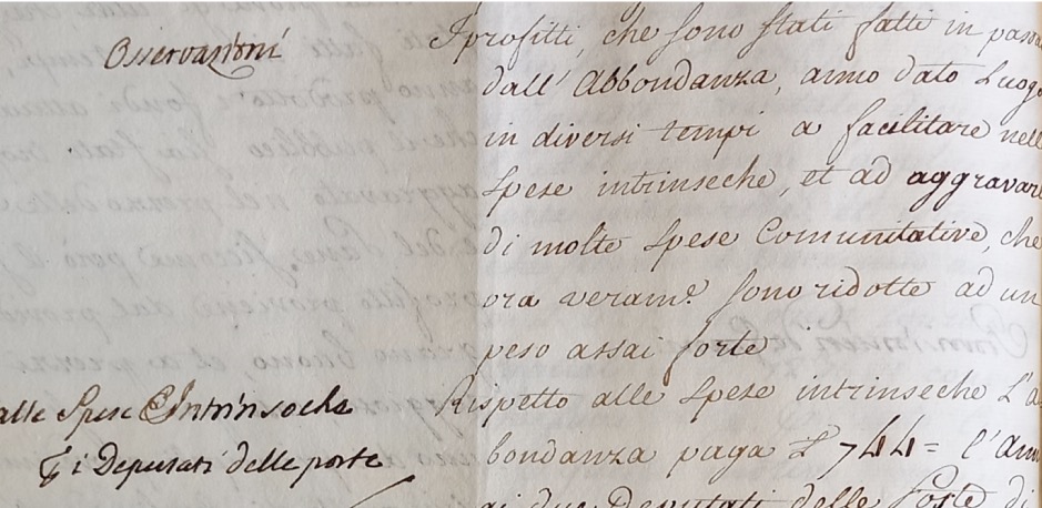 I profitti che sono stati fatti in passato dall’Abbondanza hanno dato luogo in diversi tempi a facilitare nelle spese estrinseche et ad aggravarla di molte spese comunitative che ora veramente sono ridotte ad peso assai forte.