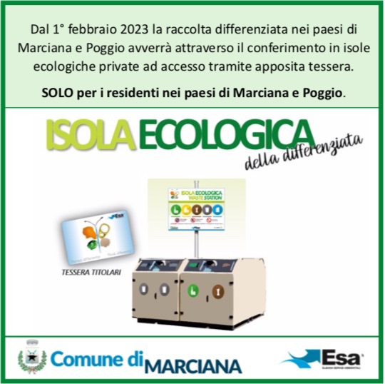 Con il cambio di modalità di raccolta nei soli borghi di Marciana e Poggio che avverrà il 1° febbraio il comune fornisce alcune informazioni importanti per gli utenti. da sapere che sono state organizzate da Esa altre due giornate di distribuzione delle tessere nei giorni di mercoledì 1 febbraio e giovedì 2 febbraio dalle 9:30 alle 13:30 presso il Centro Servizi di Marciana (attuale ambulatorio medico) in piazza For di Porta.