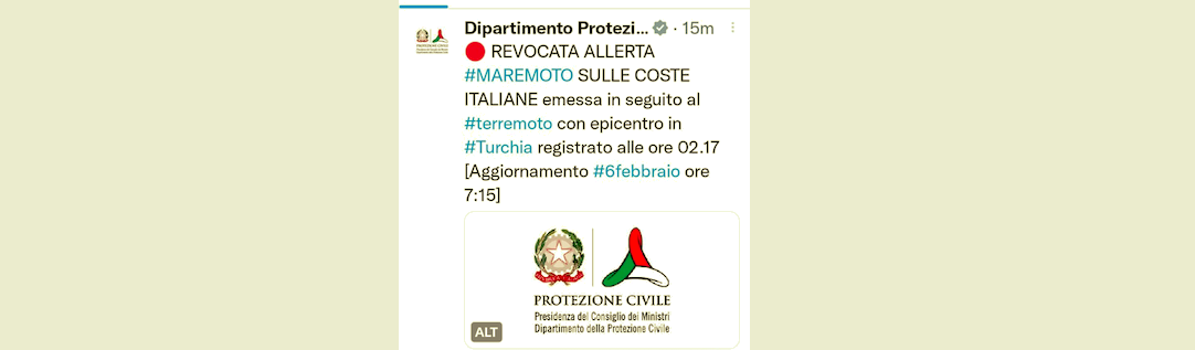 Anche la Protezione Civile Elba Occidentale, conferma il livello di allerta rosso in tutta Italia e all’Elba il pericolo in modo particolare su Marina di Campo. La notizia con il passare dei minuti si sta ridimensionando. Giunge infatti la nota della Protezione civile Nazionale che revoca l’allerta causata dal terremoto che si è registrato in Turchia durante la notte. Il susseguirsi delle notizie e che aveva intanto causato la sospensione delle corse dei treni in Sicilia e Calabria,