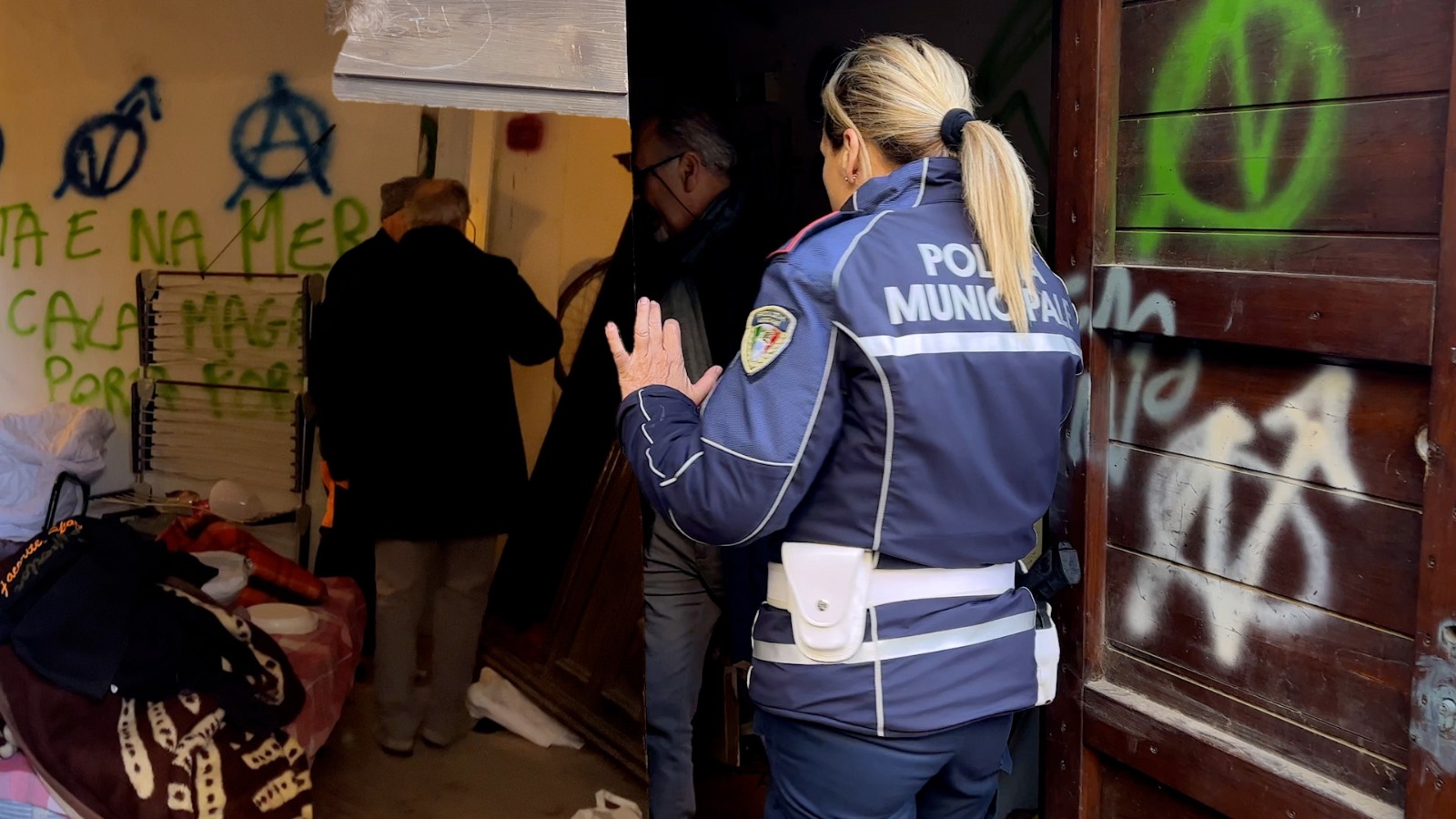 La stanza dell’omicidio, nel centro storico di Portoferraio. Davanti un giardino, di lato la scalinata che porta al porto, dentro il degrado assoluto. Per dovere di cronaca abbiamo “rubato” qualche immagine che mostriamo nel video, tralasciando quelle che abbiamo deciso di non mostrare. In questi pochi metri è avvenuto il delitto del 2 febbraio qui è morto Angelo Carugati, qui si è consumato il dramma che cambierà la vita a Mounir Ghallab, il presunto assassino. Un ginepraio di vestiti, resti di bivacchi, sporcizia, scritte sui muri, due brandine alcune coperte, qualche piumone, un tavolino e un frigo senza sportello, Uno spazio sporco con masserizie ammassate e pentole per terra. Il comune di Portoferraio ha bonificato nella mattinata del 4 febbraio il luogo che ha visto consumarsi la tragedia. Erano presenti gli operai della Cosimo de Medici, le donne e gli uomini della polizia municipale l’assessore Leo Lupi e il sindaco di Portoferraio Angelo Zini.