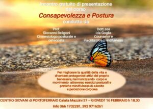 La presentazione del secondo corso di Consapevolezza e Postura, in partenza dal mese di marzo a Marina di Campo. il corso è rivolto a tutti coloro che desiderano prendersi cura di sé, imparando a costruire un rapporto corretto con il proprio corpo, magari appesantito o indolenzito da posizioni sedentarie o scorrette, a ridare fiducia alle sue capacità di recupero e ad ascoltare i messaggi che invia. A chi vuole imparare a mantenere in efficienza le proprie funzioni articolari e muscolari. A chi desidera mantenersi in forma attraverso una postura consapevole e corretta.