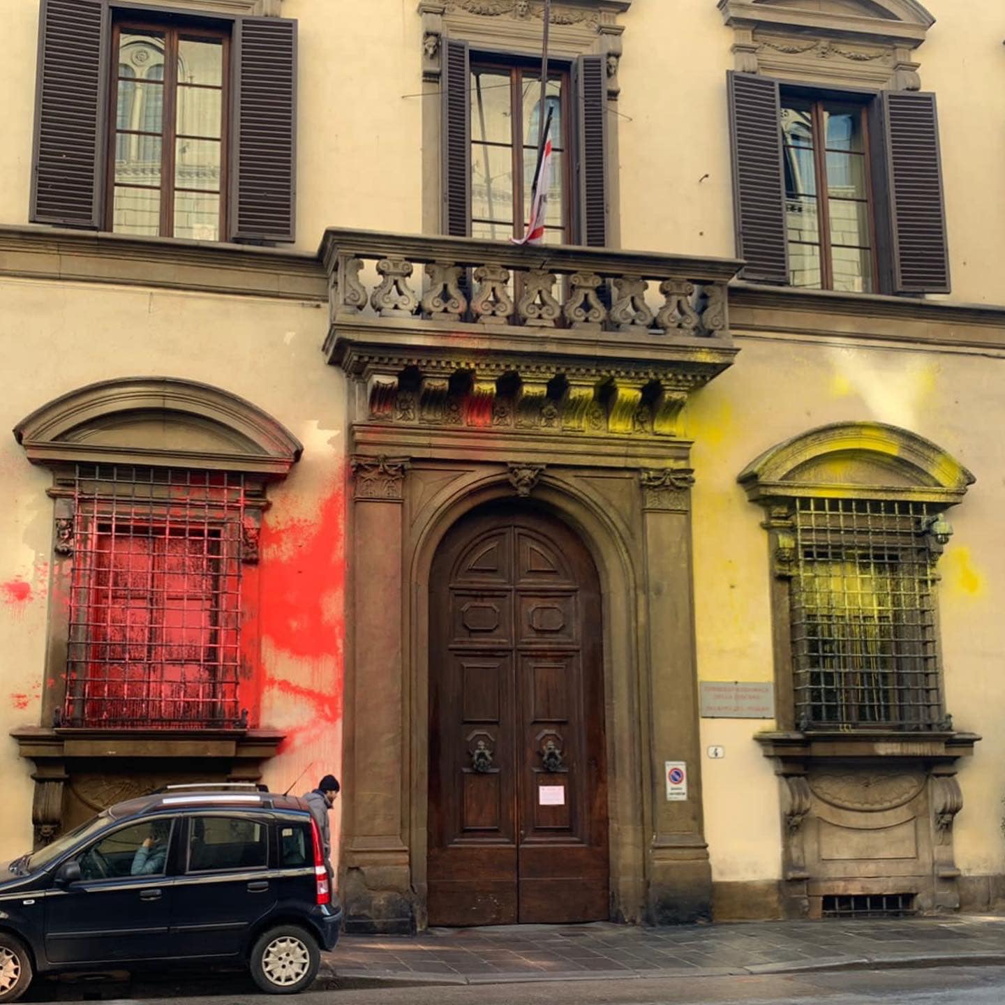 Vernice rossa e gialla sul portone del consiglio regionale della Toscana a Palazzo del Pegaso a Firenze. Ad annunciarlo dalla sua pagina facebook è il consigliere regionale Marco Landi.“Nelle prime ore della mattina di domenica 12 febbraio – racconta Landi – il #blitz degli attivisti di “Ultima Generazione” che hanno spiegato di averlo messo a segno per contestare la scelta della Regione sul rigassificatore di Piombino.