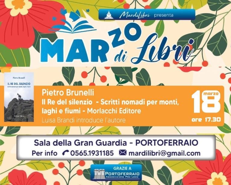 Terzo appuntamento, alla Gran Guardia, con la rassegna letteraria Marzi di Libri curata dalla libreria MardiLibri in collaborazione con la Pro Loco di Portoferraio . Sabato 18 marzo alle ore 17.30 si presenta il libro di Pietro Brunelli “Il re del silenzio” edito da Morlacchi. Brunelli è laureato in storia contemporanea, è guida ambientale e attualmente Amm in formazione presso il collegio Guide Alpine della Lombardia. La presidente della Lega Navale sezione di Portoferraio Luisa Brandi dialogherà con l’autore. “Questa raccolta di racconti – anticipa Brandi – ci condurrà in un toccate viaggio emozionale fatto di suoni, meditazioni, turbamenti e momenti di quiete vissuti nell’intimità dei viaggi di Pietro, ma capaci di uscire da quel guscio per appassionare a loro volta, tutti quei lettori curiosamente remissivi dinanzi ai tempi e alle rivelazioni di Mare Natura”. L’evento è in collaborazione con il Cai sotto sezione Elba che interverrà con il vicereggente Claudio Nardelli e il consigliere Riccardo Fioretti.
