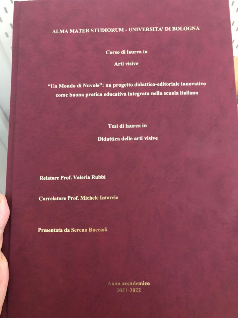 «La tesi – scrive la dott.ssa Serena Buccioli – è volta a documentare lo svolgimento ed evidenziare le potenzialità del progetto didattico-editoriale “Un Mondo di Nuvole”. La scrivente ha partecipato alla quarta edizione del progetto, svolta nell’anno scolastico 2021-2022, in qualità di tirocinante presso la casa editrice “Persephone edizioni”, la quale ha curato gli aspetti formali di redazione, pubblicazione e diffusione dell’elaborato finale. Il libro raccoglie testi, disegni e riferimenti digitali alle composizioni musicali, creazioni inedite come risultato dei percorsi laboratoriali svolti dagli alunni coinvolti. “Un Mondo di Nuvole” è un progetto didattico-editoriale multidisciplinare e transnazionale rivolto agli studenti della scuola secondaria di primo grado che ha coinvolto, nella quarta edizione, otto istituti sul territorio italiano andando a costituire una vera e propria Rete di scuole che ha permesso, tramite l’ausilio dei mezzi tecnologici, il confronto e lo scambio di idee tra allievi e docenti partecipanti, protagonisti attivi nella scuola, provenienti da realtà territoriali distanti e diversificate ma tutti accomunati dalla passione e dall’entusiasmo per il progetto “Un Mondo di Nuvole”.»