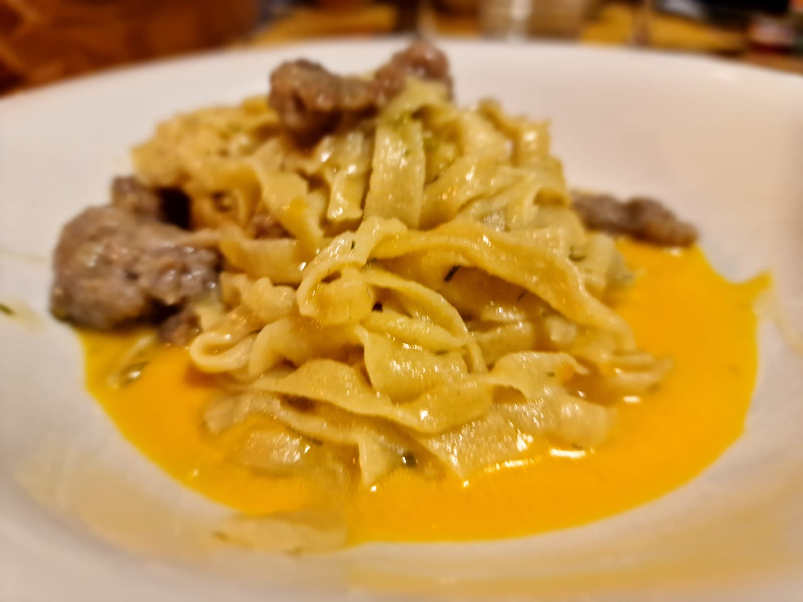tagliolini con grani antichi , crema di zucca , salsiccia di Leo e nepitella