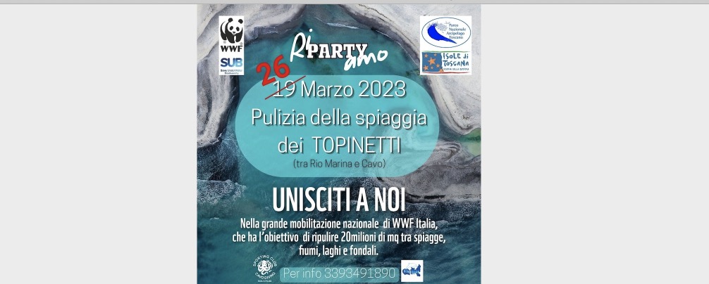 L’Associazione ElbAMare e lo Sporting Club Cavo Diving organizzano Domenica 26 Marzo la pulizia della Spiaggia di Topinetti (lato destro). La giornata di pulizia si svolge in collaborazione con ESA e con il sostegno del WWF che regalerà a tutti i partecipanti che aderiranno all’iniziativa il Kit WWF composto da sacca, maglietta e cappellino dell’evento RiPartyAMO! L’appuntamento è a partire dalle 10h fino al primo pomeriggio di domenica 26 marzo sul versante destro della spiaggia di Topinetti, alla fine della vecchia strada. Importante! Per evitare di bloccare il passaggio ai mezzi vi preghiamo di non arrivare in macchina fino al punto di ritrovo, ma di lasciare l’auto sul bordo della provinciale o al parcheggio del ristorante nella spiaggia a sinistra e fare una breve passeggiata.