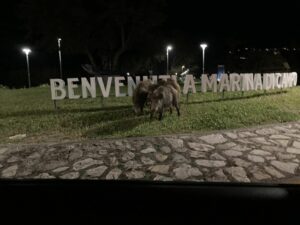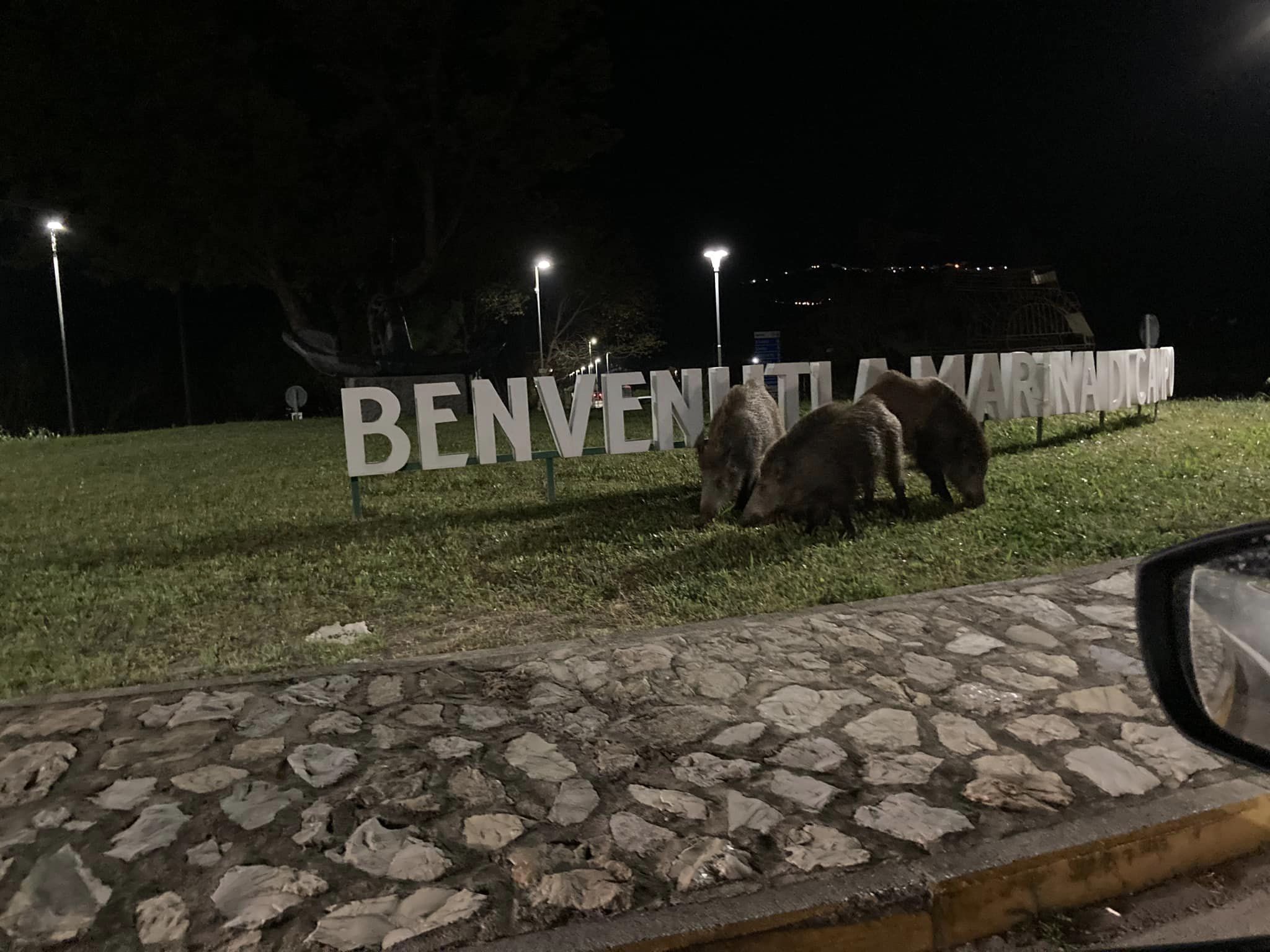 Che dire? La presenza degli ungulati in ogni dove sull’isola non stupisce più nessuno, ma questa è almeno pittoresca: tre grossi cinghiali sono stati fotografati nella serata di giovedì 20 aprile – intorno alle 21,30 – al pascolo sulla rotonda della Serra, il “benvenuto agli ospiti” di Marina di Campo. Si sono sprecati i commenti sarcastici sui social, del tipo “un bel comitato di accoglienza”, oppure “beh, si vede che qui si trovano bene”. Più amaro il commento dell’autrice delle foto, Alessandra Spinetti, riferito all’argomento del giorno qui a Marina di Campo: “Appunto, benvenuti a Campo. Fra poco, quando chiuderà l‘aeroporto, hai voglia a pascolare cinghiali…”