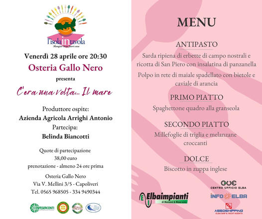 Serata con la tradizione dei piatti di mare domani sera all’Osteria Gallo Nero di Capoliveri, 4° appuntamento stagionale per L’isola in tavola, la rassegna gastronomica organizzata da Confesercenti in collaborazione con Accademia Italiana della Cucina e Patrocinata dal Parco Nazionale dell’Arcipelago toscano. Struttura di pregio e dagli ambienti piuttosto curati, il Gallo nero è nato nel 2014 dalla passione per la cucina e per la ristorazione di Claudia, del marito Paolo e di Umberto, fratello di Claudia e cuoco con esperienza ventennale. Curiosa l’idea da cui nasce l’insegna raffigurante “il Gallo”, originariamente parte di un lampadario della casa di Claudia e Umberto e legato ad un episodio familiare che ha dato spunto e nome all’Osteria stessa. Posizionata nel cuore del borgo antico di Capoliveri, l’Osteria del Gallo nero è sull’isola un esercizio molto apprezzato e caratterizzato da una cucina attenta alle tradizioni toscane e locali e che usa i prodotti del territorio come filosofia di lavoro . Per la cena di venerdi l’osteria propone un menu basato sul pescato locale (Sarda e Granseola) e sui profumi delle erbe di campo, il tutto poi accompagnato dai vini dell’azienda Arrighi di Portoazzurro. Ospite della serata l’artista Belinda Biancotti.