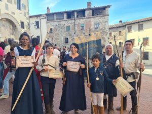 7 Maggio.Bellissima giornata ad Anghiari città affascinante, in collina, in gara storica Lam organizzata dalla compagnia Anghiarese che ringraziamo ,in particolare per averci accolto con amicizia e supportati e per averci regalato queste emozioni.Gara suggestiva con bersagli fantasiosi ma con percorso duro ,che atleticamente mette alla prova dove il grande Falco ha partecipato con 7 atleti e dove quattro di questi sono andati a podio:Liberatori Lucio 1 ‘ cat under 10,Mazzi Tommaso 2′ cat under 14 ,Nunez Jeannette,alla sua prima gara outdoor , nella folta cat Das e’ arrivata 3′ e Schezzini Claudia 3′ cat Dame senza finestra. Prima gara l’outdoor per Nuccetelli Lorenzo che pur essendo alle prime armi sfoggia un buon punteggio.