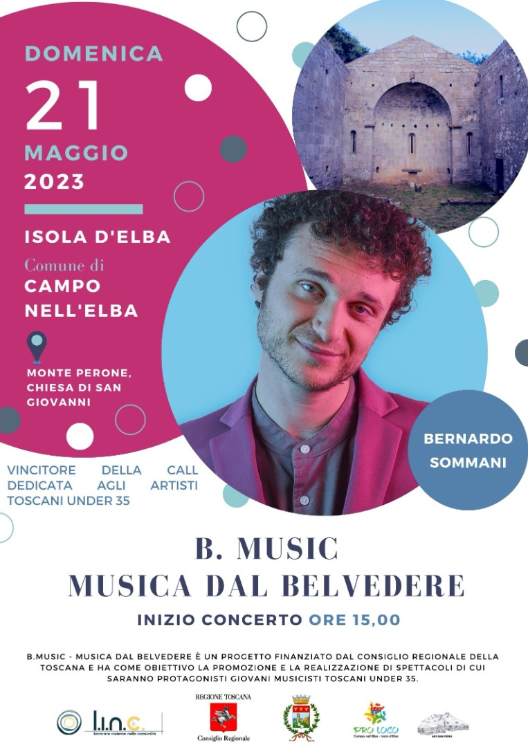 Domenica 21 maggio a partire dalle ore 15,00 presso la Chiesa di San Giovanni in Campo sul Monte Perone si terrà il primo concerto di B.Music – Musica dal belvedere. Ad esibirsi in questo luogo magico sarà Bernardo Sommani, un musicista e cantautore classe 1993 di Pisa.