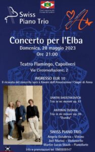 Si svolgerà, Domenica 28 maggio: ore 21:00 al teatro Flamingo di Capoliveri, nell’arco dell’iniziativa “Concerti per l’Elba”, la seconda esibizione di musica classica degli Swiss Piano Trio. Angela Golubeva – Violino, Joel Marosi – Violoncello, Martin Lucas Staub – pianoforte. Il trio fondato nel 1998, si è esibito in oltre 40 paesi di tutti i continenti, guadagnato una notevole reputazione di eccezionale omogeneità e grande espressività. È stato descritto dalla rivista statunitense Fanfare come “uno dei migliori complessi di piano trio sulla scena odierna.”