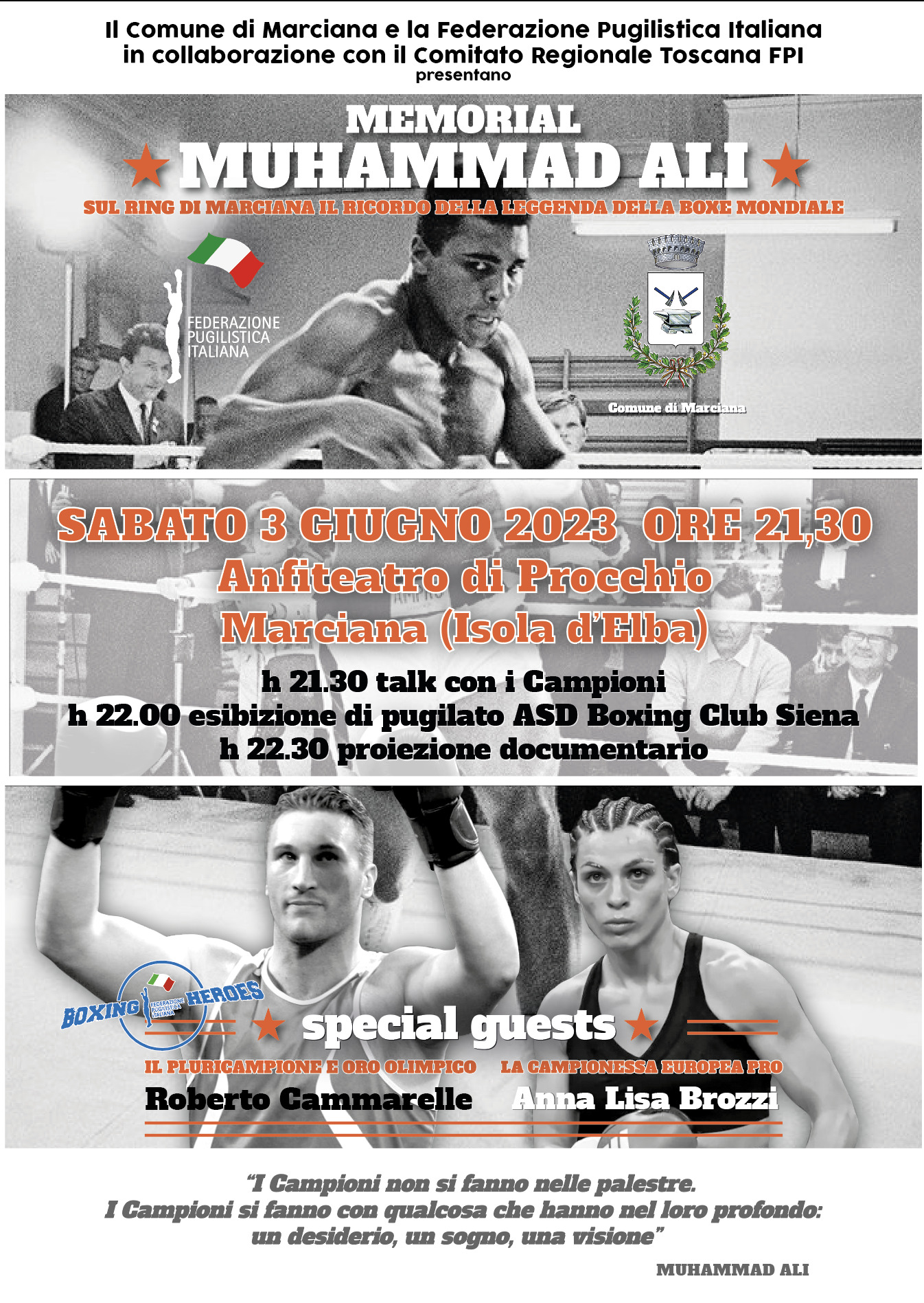 Il memorial, organizzato dalla Federazione Pugilistica Italiana in collaborazione con il Comune di Marciana, si svolgerà sabato 3 giugno alle ore 21.30 con la partecipazione dei Campioni/Ambassador Roberto Cammarelle e Anna Lisa Brozzi.