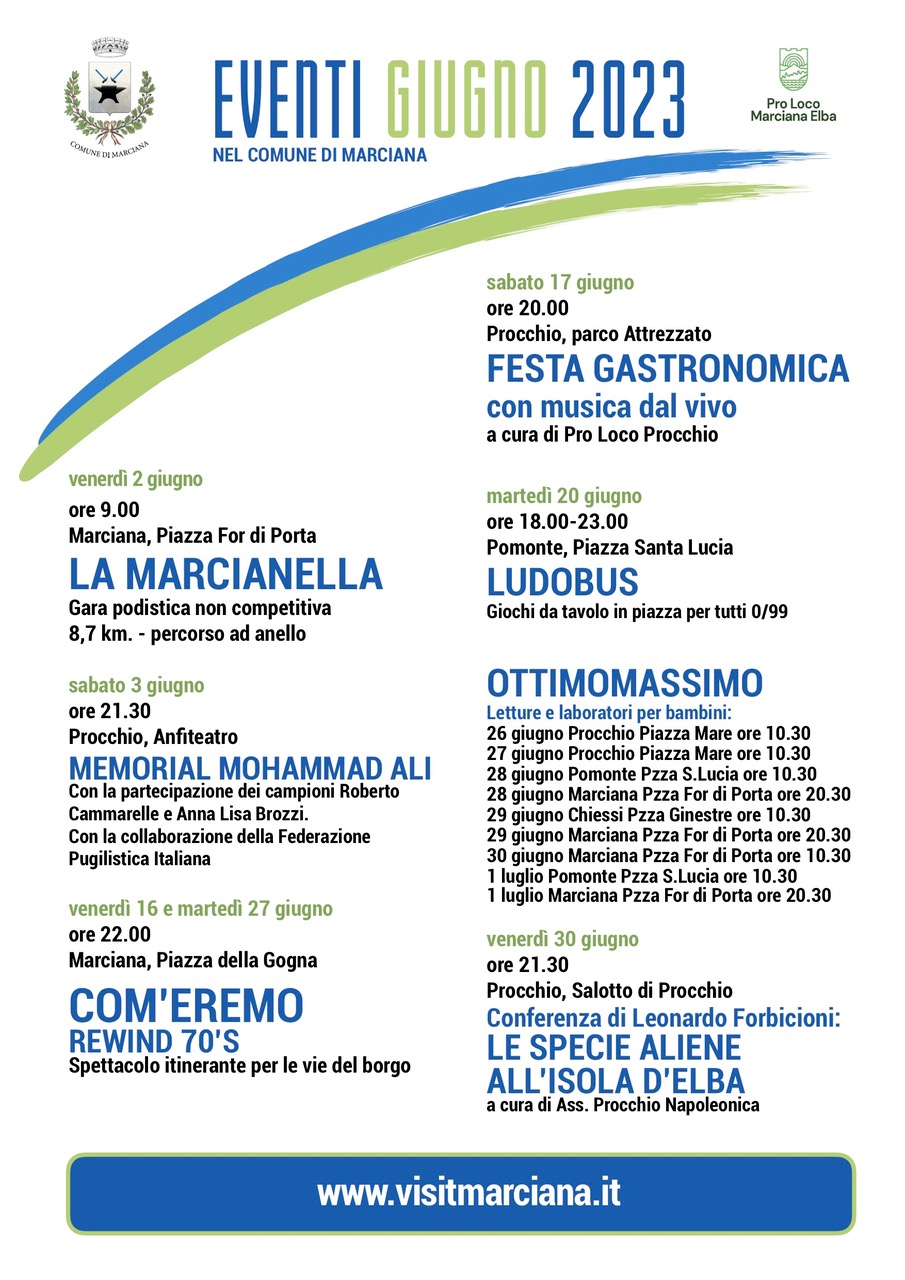 Il mese di giugno nel comune di Marciana inizia con ben due eventi dedicati allo sport. La gara podistica non competitiva Marcianella 2023 che si terrà venerdì 2 giugno a Marciana e la serata Memorial Mohammad Alì in onore del campione di pugilato nell’anfiteatro di Procchio sabato 3 giugno.