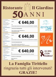 Durante la serata sono state efettuate delle donazioni in beneficenza che la famiglia ha devoluto a favore di Agbalt, Diversamente Sani e i Sogni di Anna .