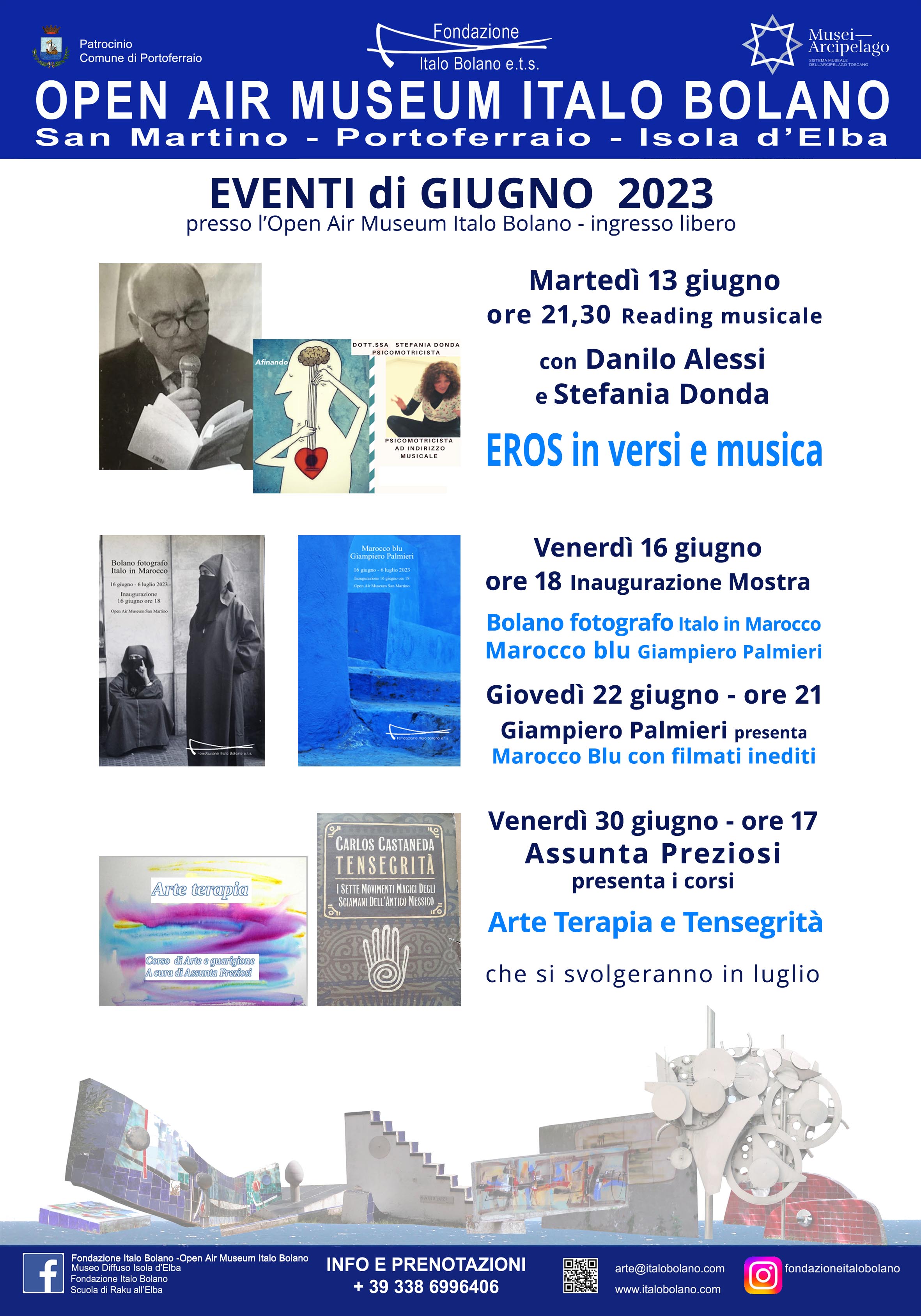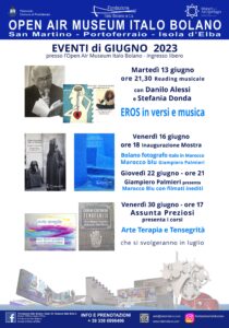 Con il mese di Giugno riprendono gli eventi e i corsi d’arte proposti dalla Fondazione Italo Bolano all’Open Air Museum di San Martino, già aperto dal primo maggio, sotto il patrocinio del Comune di Portoferraio e la collaborazione del Sistema Museale dell’Arcipelago Toscano.