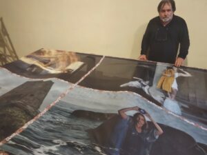 Di fronte ad essi, sul lato destro, è stata collocata una composizione, di tre metri per due, con quattro ingrandimenti di altrettante foto, che richiamano i soggetti dei dipinti, collegandoli ai quattro elementi naturali che costituiscono la realtà materiale: il fuoco, l’acqua, la terra e l’aria.