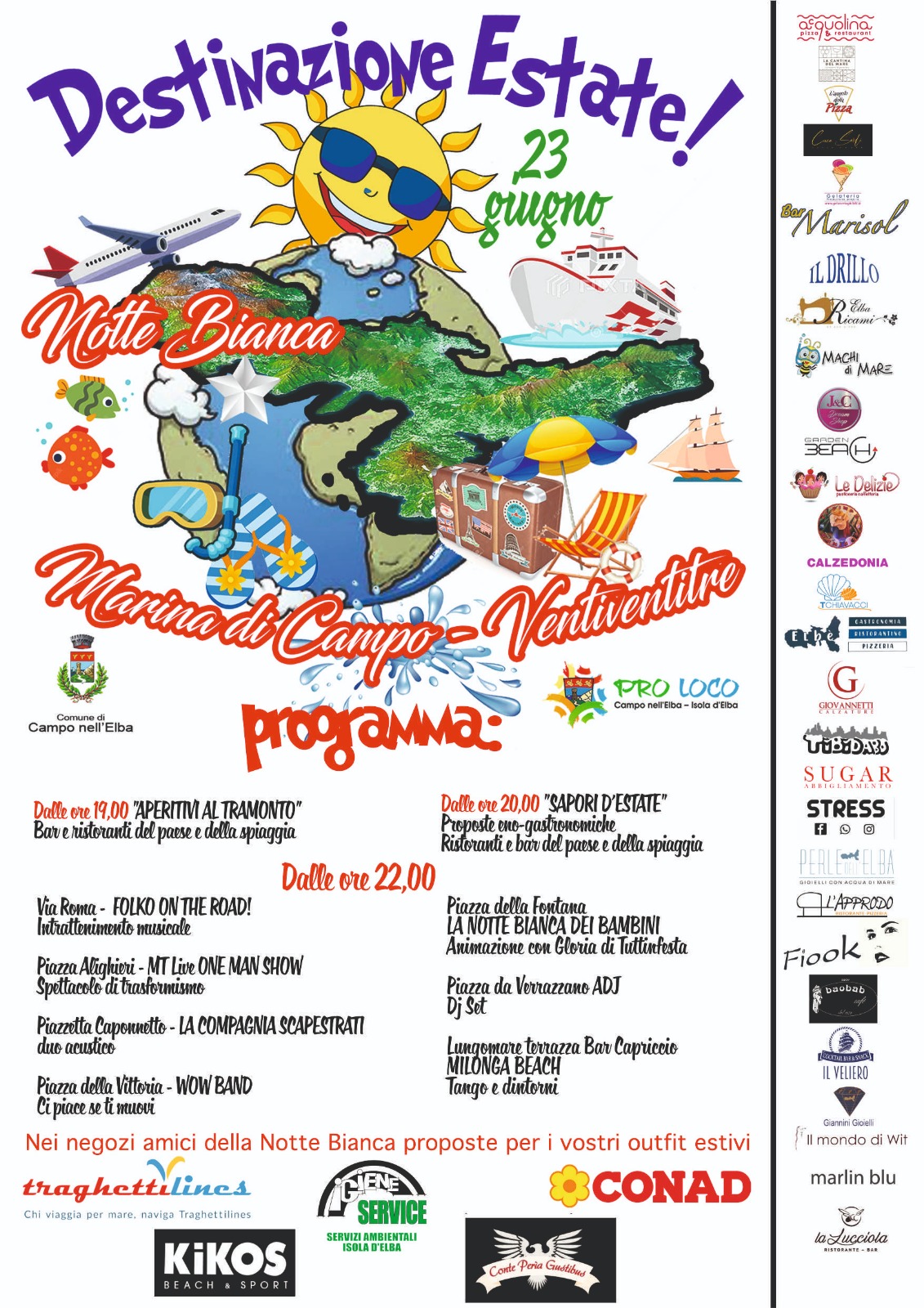 La Proloco, in collaborazione e con il contributo del comune di Campo nell’Elba, organizza la Notte Bianca che si terrà a Marina di Campo il 23 giugno.Quest’anno il titolo è accattivante e diretto:”Destinazione Estate”.