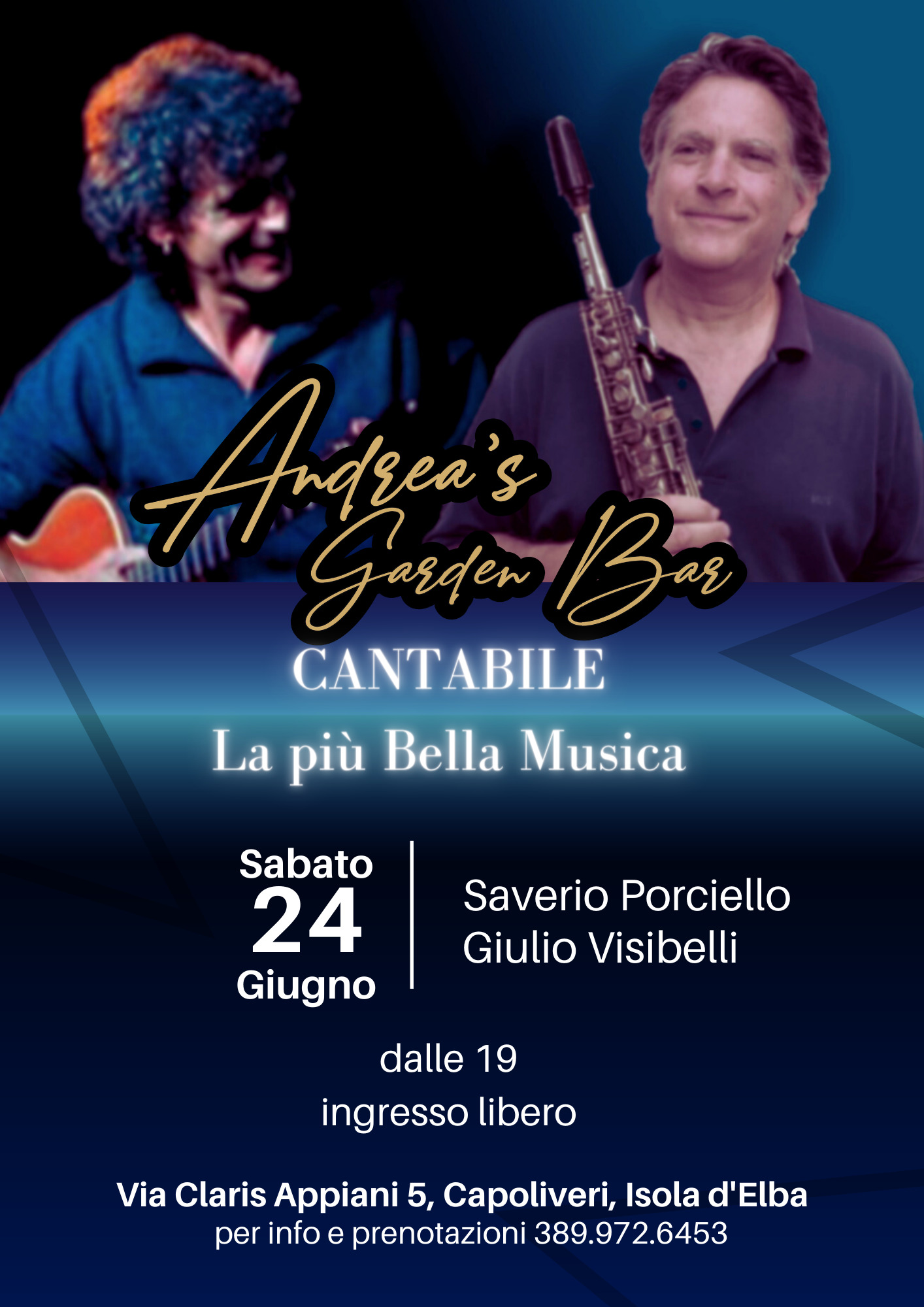 Il meraviglioso ed elegante giardino dell’Andrea’s Garden Bar nel centro di Capoliveri ospiterà domani, sabato 24 giugno dalle ore 19, un duo di musicisti d’eccezione: Saverio Porciello (Eugenio Finardi, Ivano Fossati, Ornella Vanoni, Enrico Ruggeri, etc) e Giulio Visibelli (G. Basso & T. De Piscopo, S. Caputo, G. Gaslini, Civica Jazz Band, etc). La chitarra di Porciello e il sax di Visibelli esalteranno la romantica atmosfera di una delle terrazze più belle dell’Isola d’Elba, con un panorama mozzafiato su Porto Azzurro, con le note del concerto “Cantabile-la più bella musica”. Nel frattempo sarà possibile degustare gli originali cocktail gourmet di Davide Zanga. Una serata assolutamente da non perdere domani all’Andrea’s Garden Bar, Capoliveri, Elba, via Claris Appiani 5.