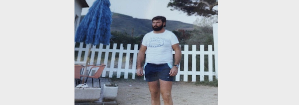 Lui sempre a piedi scalzi con questi piedi giganti e la sua maglietta rossa con l’alone del sale a mezzo busto.