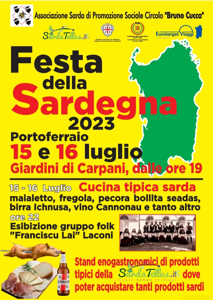 “L’associazione Sarda di Promozione Sociale Circolo Bruno. Cucca, di Portoferraio, organizza per i giorni di sabato 15 e domenica 16 Luglio 2023, ai Giardini di Carpani a Portoferraio la “FESTA DELLA SARDEGNA 2023”. Un appuntamento tipico che si rinnova anche per quest’anno. Nell’occasione si potranno gustare presso il ristorante allestito, i piatti tipici sardi e acquistare presso gli stand molti prodotti della Sardegna.