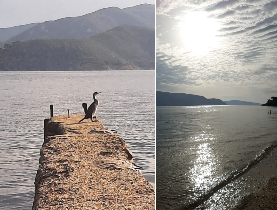 Non ci sono solo i volontari di Legambiente Arcipelago Toscano a tenere d’occhio il nido di tartaruga marina di Galenzana (e quello di Lacona): la mattina presto in punta al moletto marrone e sbrecciato che divide in due la spiaggia, i più fortunati possono trovare un piccolo guardiano impettito, con la pancia bianca e il becco affilato, un marangone dal ciuffo che guarda il sole sorto da poco in un cielo luminoso dopo l’alba, dove il vento forma onde increspate che si specchiano nel mare insieme alla palla incandescente del sole.