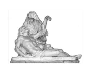 “Opera di maniera del 1892 di Giusto Giusti ,la Vergine è inginocchiata e sorregge con la gamba ed il braccio destro il corpo del Figlio giacente a terra cingendogli la testa con la mano.Con la sinistra tiene sollevato un braccio del Cristo che evidenzia tutta la sofferenza di quel corpo attraverso la mano abbandonata ormai senza forza. Del gruppo marmoreo colpisce immediatamente il volto della Vergine. Quest’ultima, avvolta da vesti artisticamente drappeggiate, ha la fronte quasi aggrottata e lo sguardo che sembra esprimere allo stesso tempo, severità, sorpresa e rassegnazione per la sorte del Figlio”