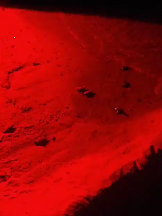 E alle 23,25 di un miracoloso e fresco 5 agosto, 51 piccole tartarughe marine Caretta caretta sono emerse improvvisamente dal nido, sciamando sulla sabbia illuminata dalle luci rosse – che a differenza di quella bianca non disturba e attrae le tartarughe – dai volontari di Legambiente e si sono precipitate in mare seguendo la pista che era stata preparata nei giorni scorsi.