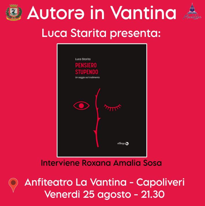 Protagonista sarà Luca Starita che torna all’Elba dopo aver già presentato, lo scorso anno, il suo “Canone ambiguo. Della letteratura queer italiana” (l’evento, inserito nella programmazione del Festival Elba Isola Musicale d’Europa, si svolse in occasione del centenario della nascita di Pier Paolo Pasolini presso la Biblioteca Foresiana di Portoferraio). Questa volta, introdotto dalla psicoterapeuta Roxana Amalia Sosa, Starita presenterà “Pensiero stupendo. Un saggio sul tradimento” (effequ, 2023).