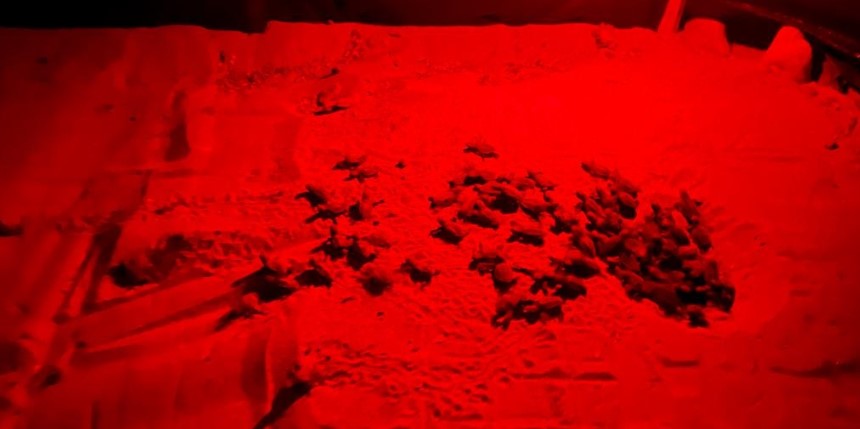 Alle 21,45 del 25 agosto si è infatti formato nella sabbia del nido il cratere che di solito (ma non sempre) annuncia la schiusa. Alle 21, 54 le prime tartarughine Caretta caretta hanno iniziato a far capolino dalla sabbia, ma si è subito capito che lì sotto erano in molte a spingere per emergere e presto il piccolo cratere brulicava di piccole tartarughe che hanno iniziato la loro corsa verso il mare che le prime hanno raggiunto alle 22,06, illuminate dalle luci rosse delle torce che non le disturbano. Ma le volontarie e i volontari del Cigno Verde si sono accorti subito che qualche tartarughina veniva attratta dalle luci bianche lungo la costa anche se l’intero percorso protetto che le accompagnava verso il mare era schermato da rete ombreggiante.