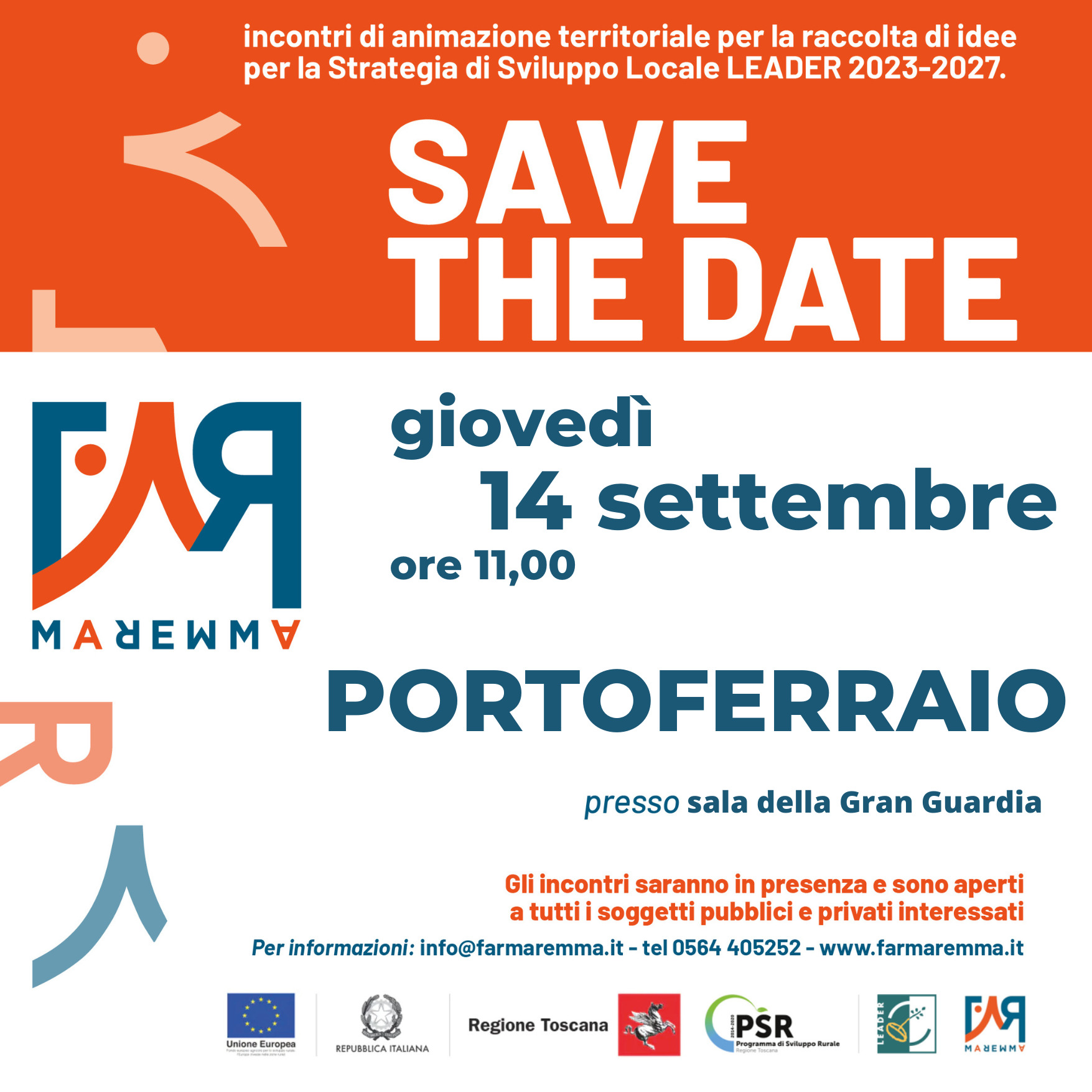 Il Gal Far Maremma organizza un incontro pubblico a Portoferraio (Isola d’Elba) il giorno giovedì 14 settembre, alle ore 11, presso la sala della Gran Guardia, per raccogliere idee e progetti propedeutici alla definizione della strategia di sviluppo locale Leader 2023 -2027.