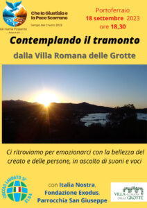 “Contemplando il tramonto dalla Villa romana delle Grotte”. Per il secondo anno, ci sarà l’iniziativa promossa dal Circolo Laudato Si’ Elba e dalla Fondazione Villa romana delle Grotte, con la partecipazione di Italia Nostra Arcipelago toscano, della Parrocchia San Giuseppe e della Fondazione Exodus Elba.