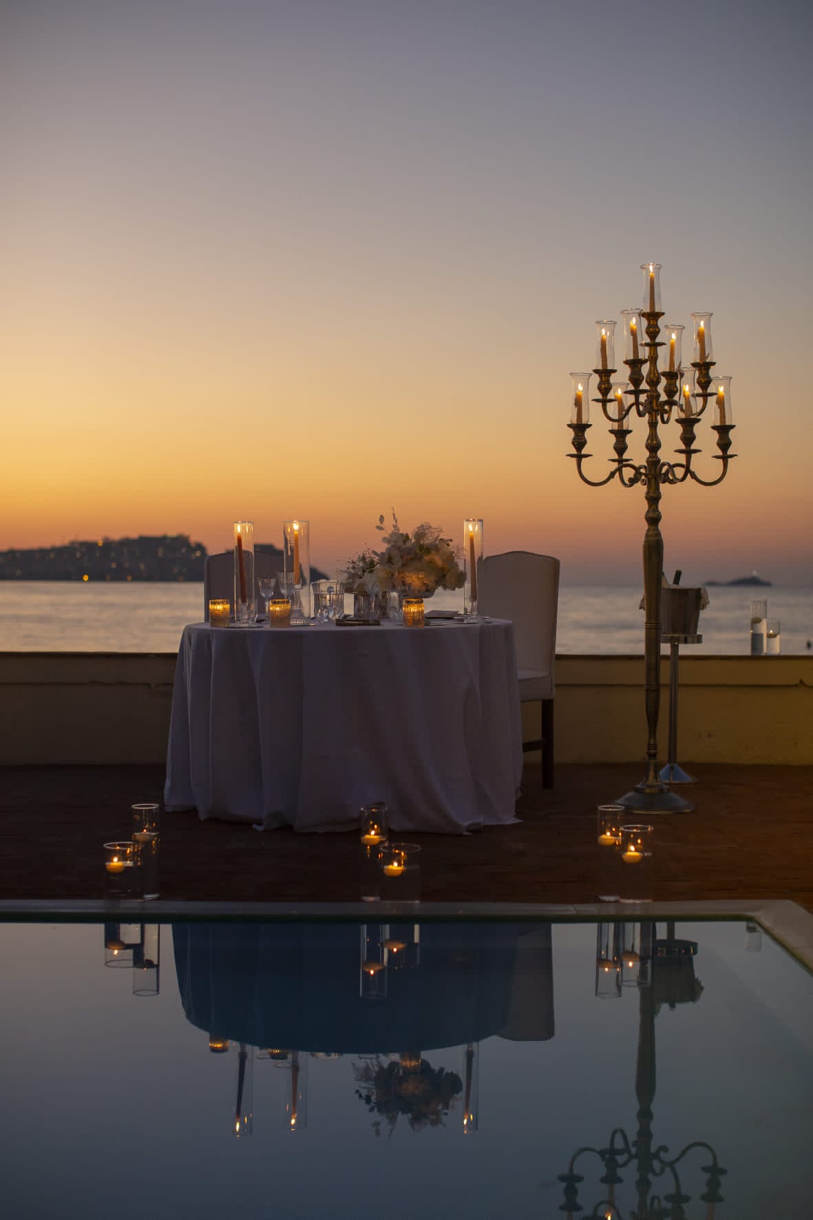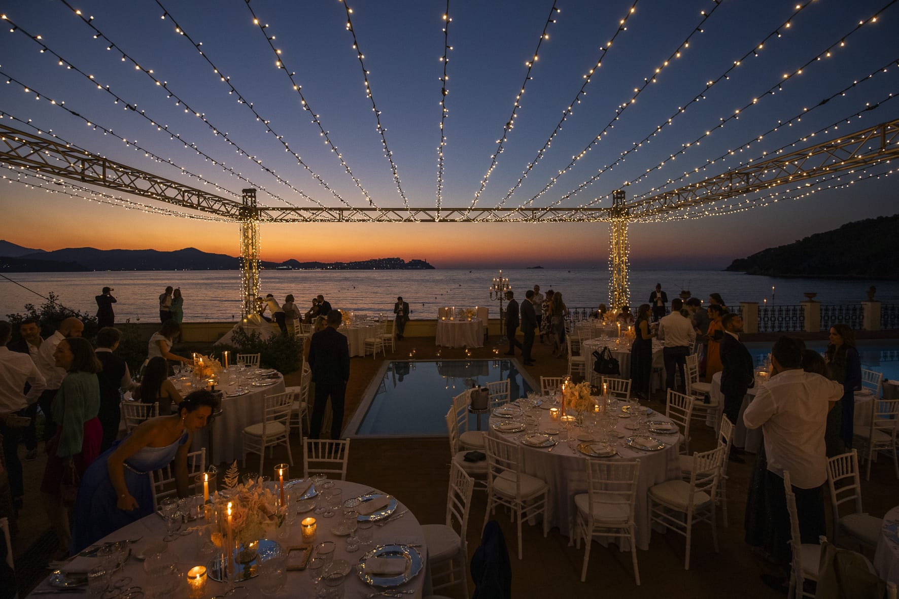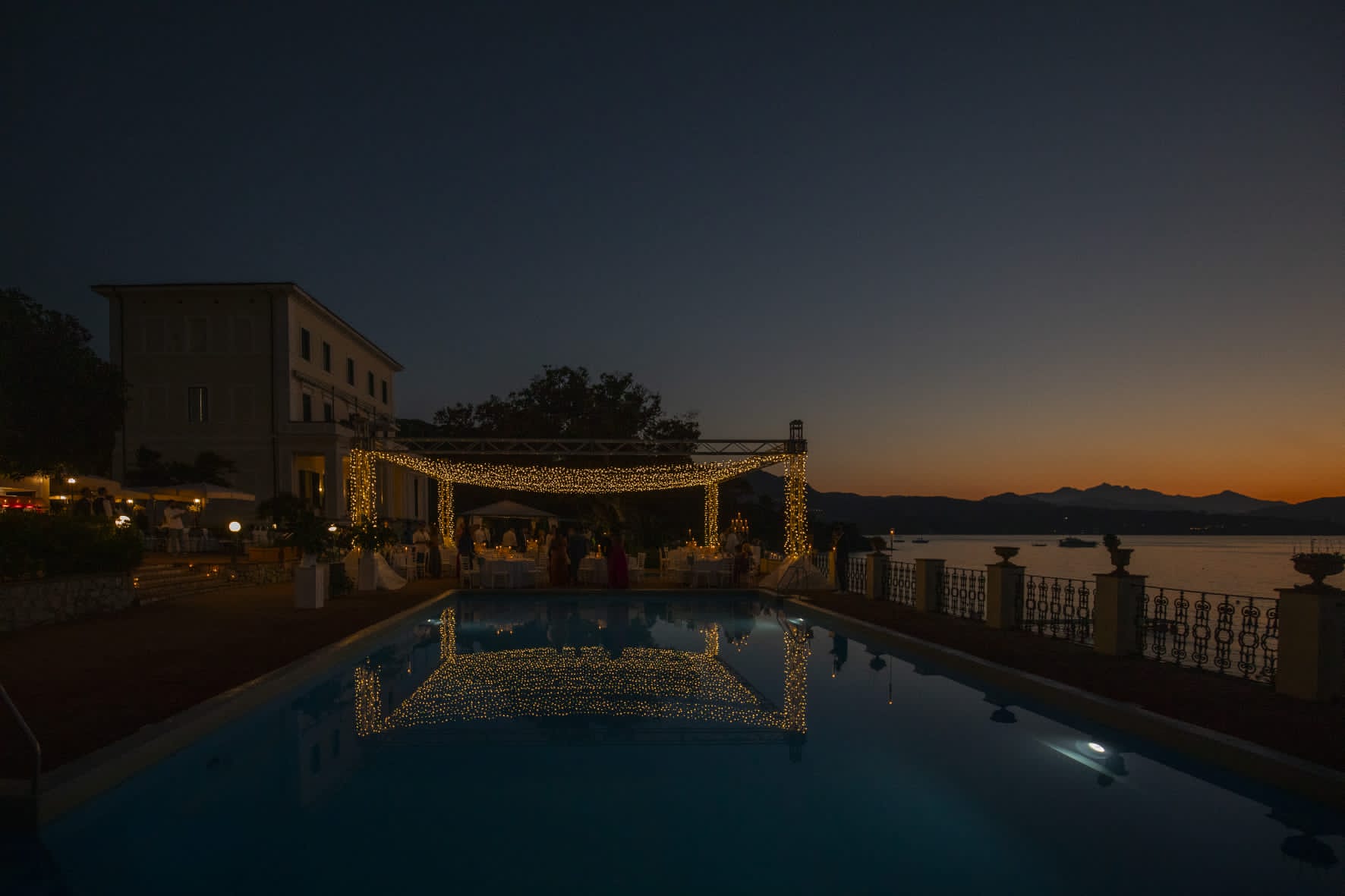 I meravigliosi allestimenti luminosi dell’ azienda Shark light show Equipment, hanno trasformato la corte esterna, affacciata sul mare, di fronte alla prestigiosa e storica Villa, in una spettacolare sala d’evento “da mille e una notte”, ricreando un cielo stellato a bordo piscina, sopra le eleganti e raffinate tavole, tale struttura era addirittura visibile per la maestosità, dalla darsena di Portoferraio; gli allestimenti floreali dello staff di flowers designer di “La Maisonnerie”, di Fucecchio, hanno arricchito, tra le cristallerie, le candele e gli argenti d’ epoca, ogni angolo dell’atmosfera, dalla cerimonia al taglio della torta, regalando fascino e poesia.