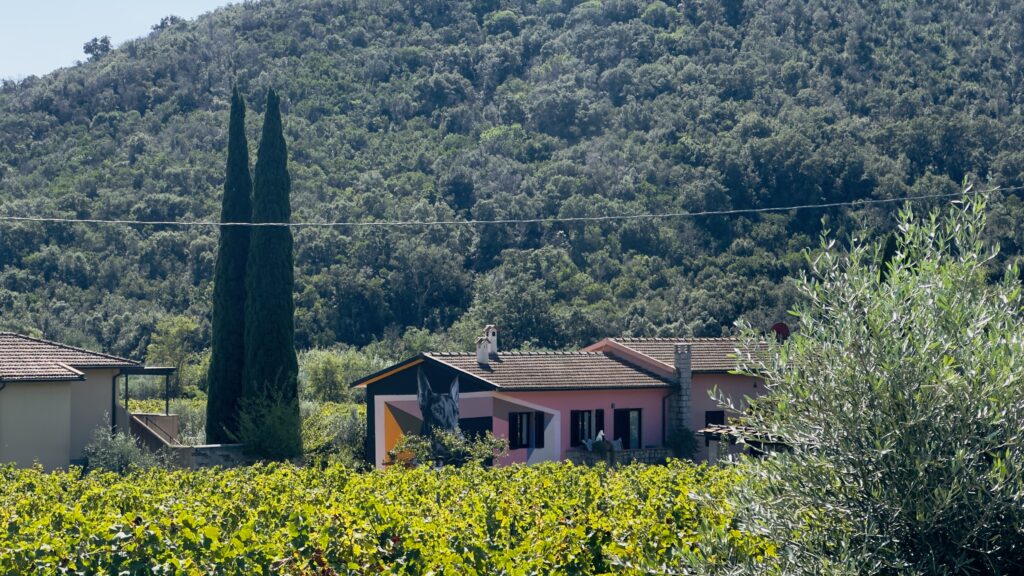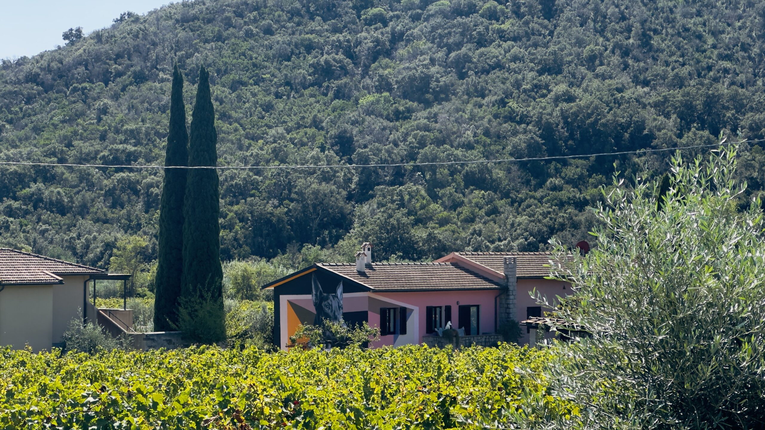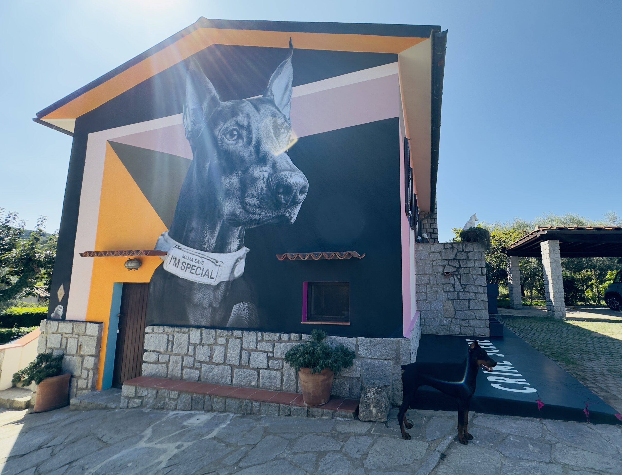 E così, il 17 settembre 2023 dopo Milano e Lugano, Yuri Catania sbarca sull’Isola per realizzare, su commissione di una nota collezionista d’arte nonché proprietaria della tenuta, un’opera artistica dal suo carattere effimero attraverso la tecnica della paste-up, carta e colla biodegradabili, che rappresenta la testa di un dobermann. L’opera di street art è ambientata sulla facciata principale del podere e caratterizzata da una prospettiva anamorfica colorata ispirata alle architetture contemporanee californiane, adiacente l’installazione “Crime Scene” che si illumina di fluorescente di notte. In totale, l’installazione si estende su una superficie complessiva di 70 metri quadrati.