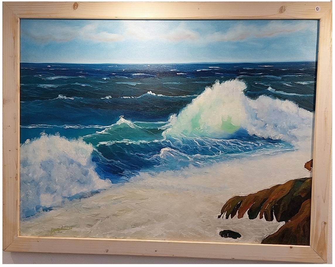 Al finire di questa, al margine destro del quadro, vi è uno scoglio con bordi separati e leggermente aperti verso il basso, dipinto di marrone piuttosto uniforme che rende l’idea della roccia bagnata dagli spruzzi delle onde. Questo è fin qui il quadro che così, come detto, appare nel suo significato reale, ben congegnato, ben strutturato e armonizzato nei colori delle forme dei vari sub assiemi nell’intera rappresentazione pittorica.