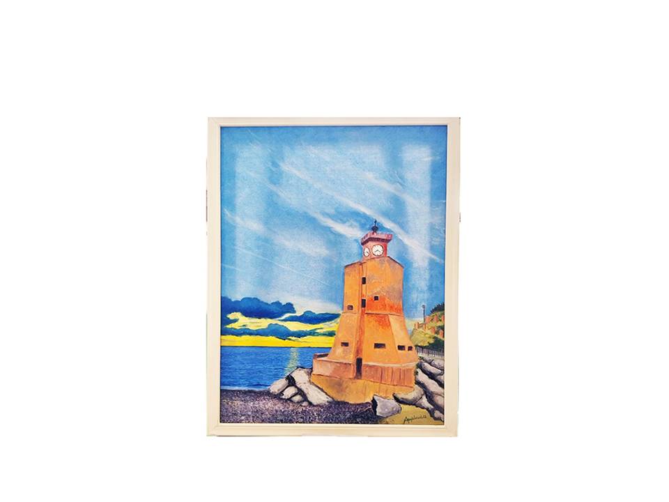 Il soggetto – L’immagine strettamente legata al soggetto dipinto è quella di uno scenario composto da una Torre centrale che sorregge un orologio, con due quadranti visibili sulla sommità. A sinistra del quadro, nello sfondo, si intravedono minacciose nubi che si profilano sopra il dorato orizzonte. Più avanti si apre una vista ampia dell’acqua del mare che si estende prospetticamente fino alle spalle della Torre. Verso il margine destro del dipinto, al posto dell’acqua vi è soltanto uno scorcio paesaggistico limitato è un sentiero che si inerpica dalla Torre fino a scomparire al margine. Tutto ciò rappresenta in modo esauriente il soggetto nell’ambiente circostante, completando l’opera senza necessità di ulteriori dettagli. Il richiamo semiotico a cui l’artista sembra ispirarsi è quello della scuola metafisica di Picasso o di De Chirico con i quali in qualche modo potrebbe essere confrontato attraverso un’ulteriore sfaccettatura nella percezione del tempo. L’opera stimola molte riflessioni, sia dal punto di vista pittorico che introspettivo dell’osservatore e del suo mondo interiore.