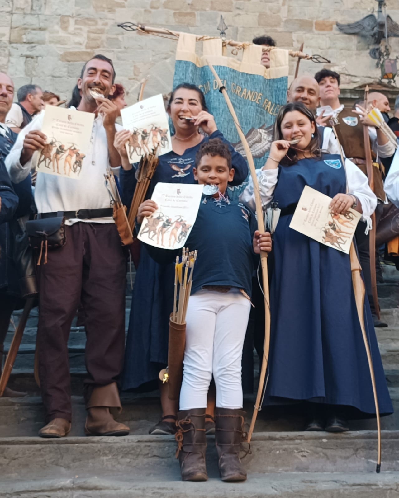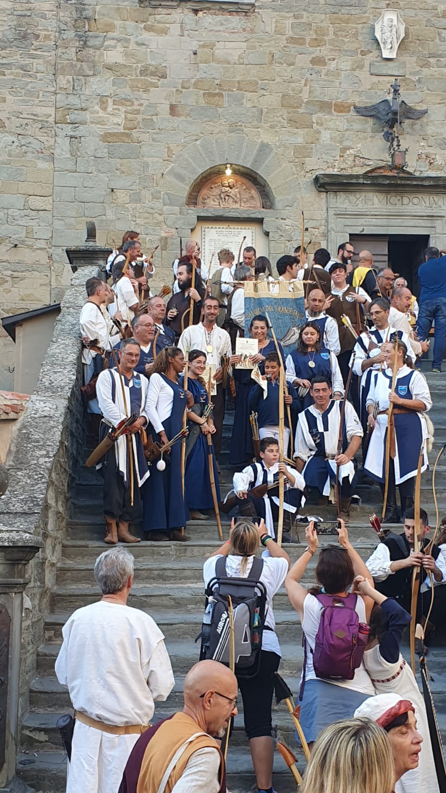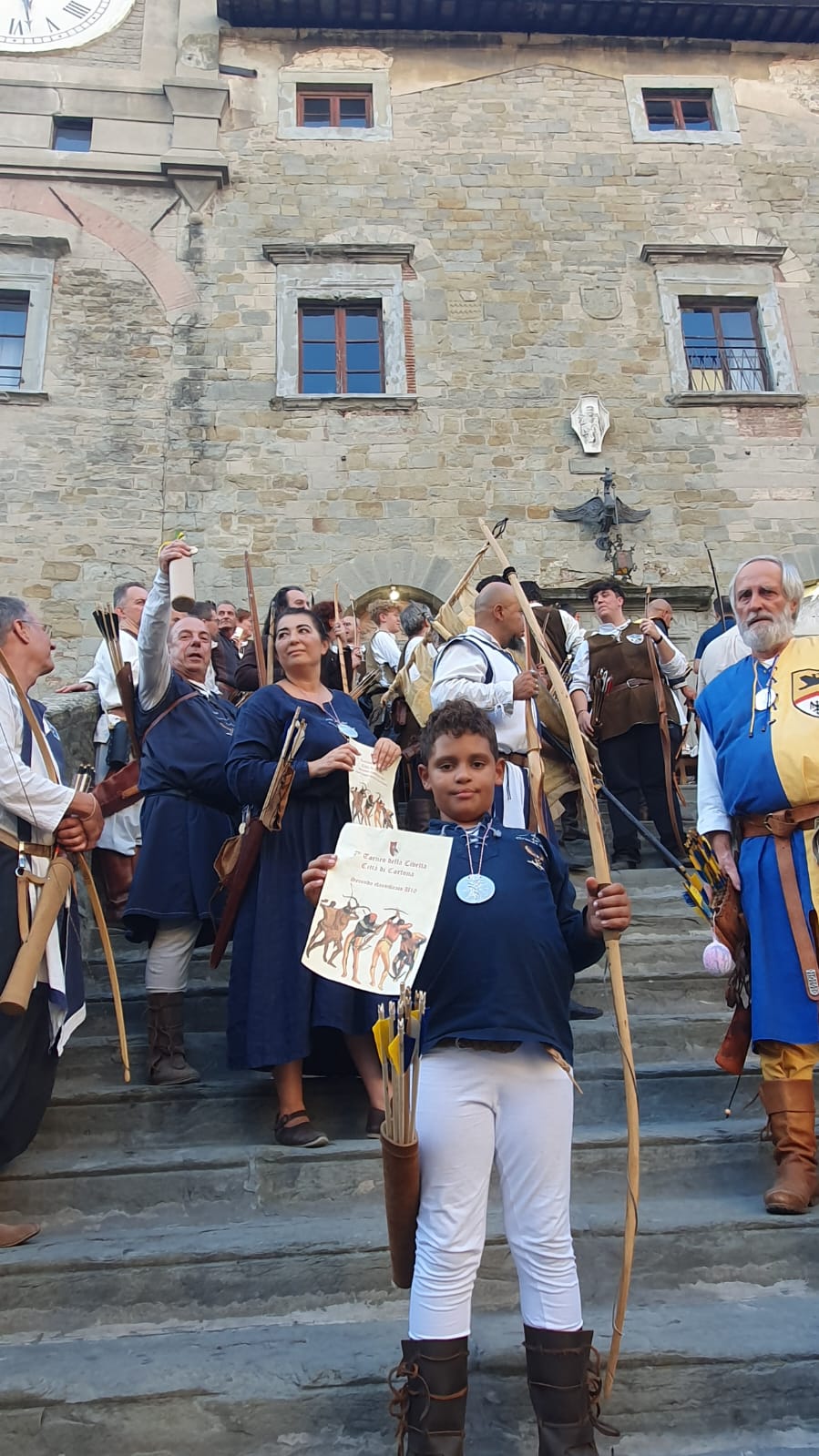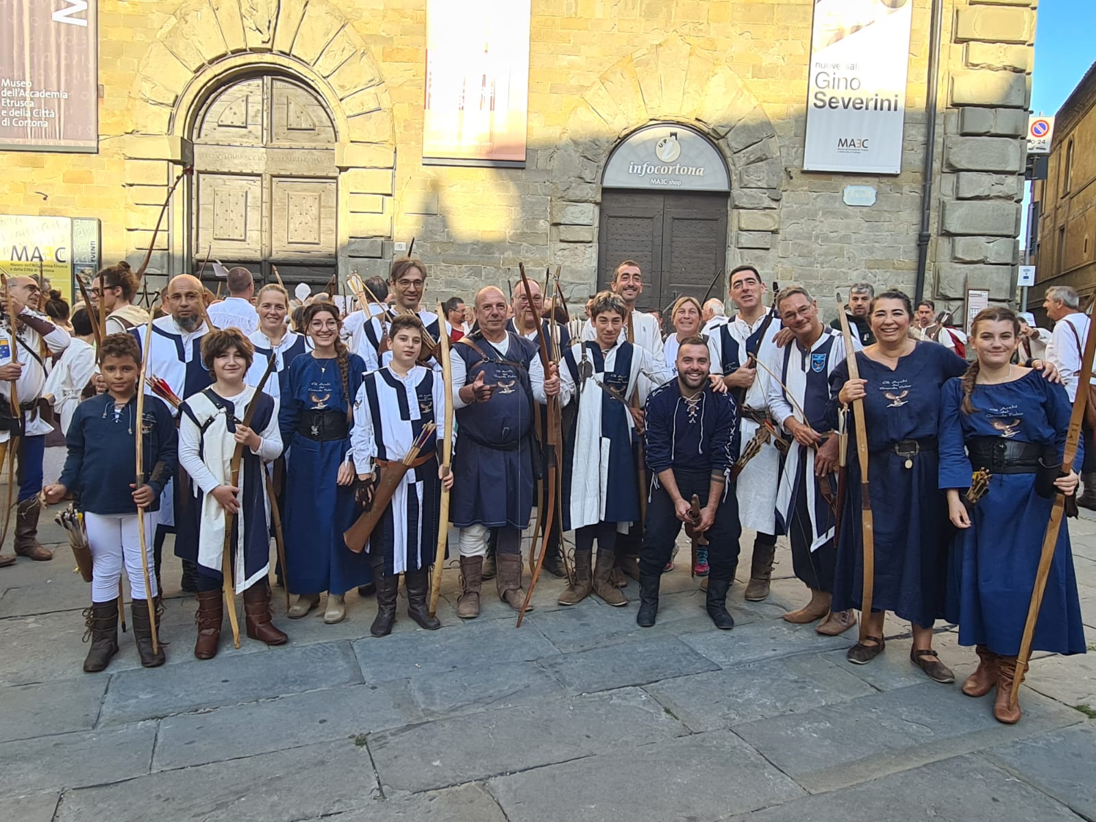 Domenica scorsa 8 ottobre,si è svolta a Cortona la penultima tappa di Campionato Nazionale Lam, in un giorno di festa per la Città ,che gode ancora di tanto turismo . Tutte le piazze e tutti i vicoli erano pieni di visitatori ,che si godevano il sole e fotografavano i nostri costumi medievali e i bersagli che erano situati anche dentro i musei, con lo stupore di noi concorrenti che abbiamo apprezzato moltissimo questa iniziativa .Tutta la gara si è svolta in scioltezza, filando veloce e tutti gli atleti hanno potuto godere dei 18 bersagli costruiti con arte e sicurezza . Il fine gara è stato accompagnato da un ottimo pranzo come tradizione Lam vuole, seguito nella piazza del Comune, da uno spettacolare gioco di bandiere ,tamburini e chiarine acclamato con un fortissimo applauso di gradimento . Passiamo alle premiazioni, svoltesi davanti ad un numerosissimo pubblico ,regalando così emozioni a tutti i concorrenti ,con il Grande Falco che per cominciare vince con la categoria più ambita e folta ,cioè quella dei Messeri Arco storico con il meraviglioso 1′ posto di Anselmi Patrizio . A seguire un ottimo 2′ posto nella categoria under 10 di Liberatori Lucio, che si prende tutto l’applauso della meravigliosa piazza .A seguire un ottimo 2′ posto nella categoria Dame foggia senza finestra di Schezzini Claudia ,che conferma ormai da tempo di stare nei posti più alti della classifica generale di Campionato Nazionale; per proseguire con un altro bel podio del 3′ posto della categoria under 17 foggia con finestra ,di Azzurra Licalzi . Ottimi piazzamenti nella categoria under 14 anche per Mazzi Tommaso a 2 punti dal terzo,di Fresta Claudio e di Nuccetelli Lorenzo.