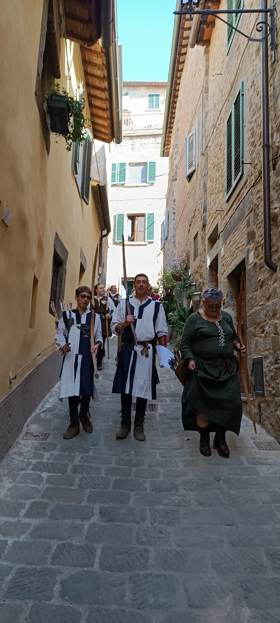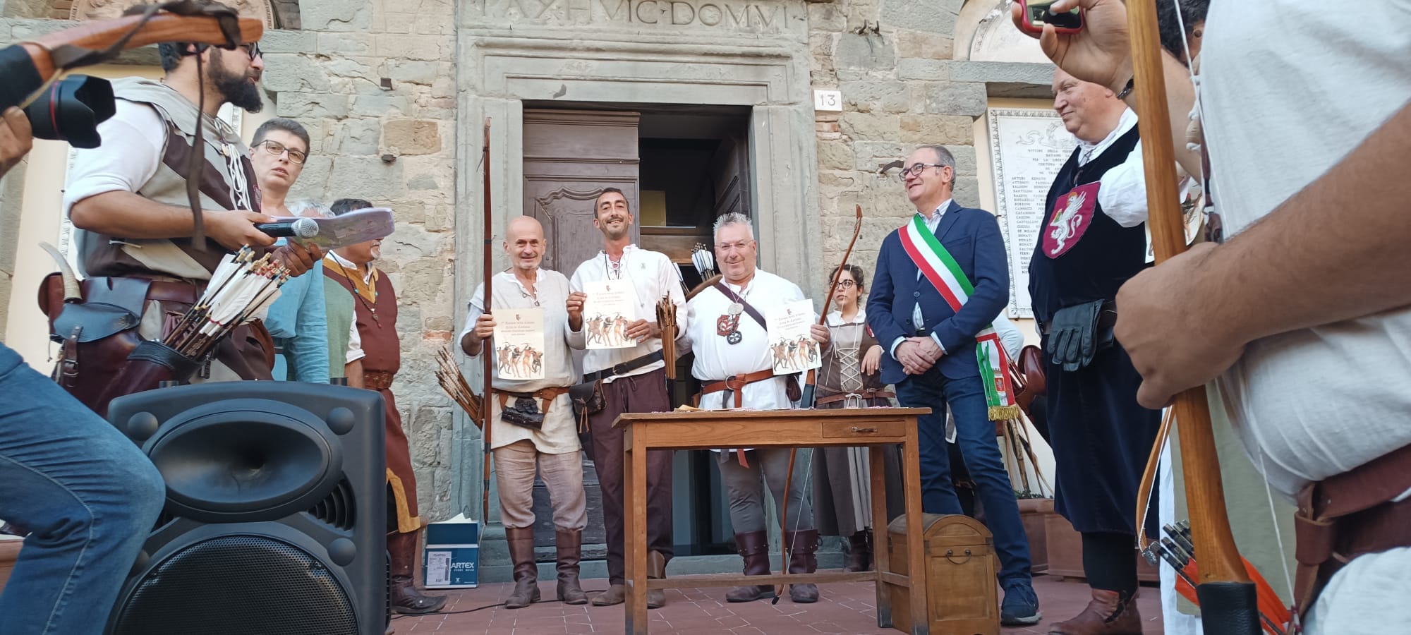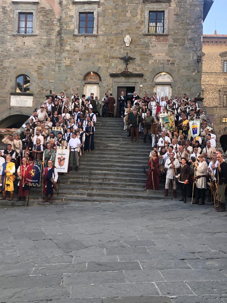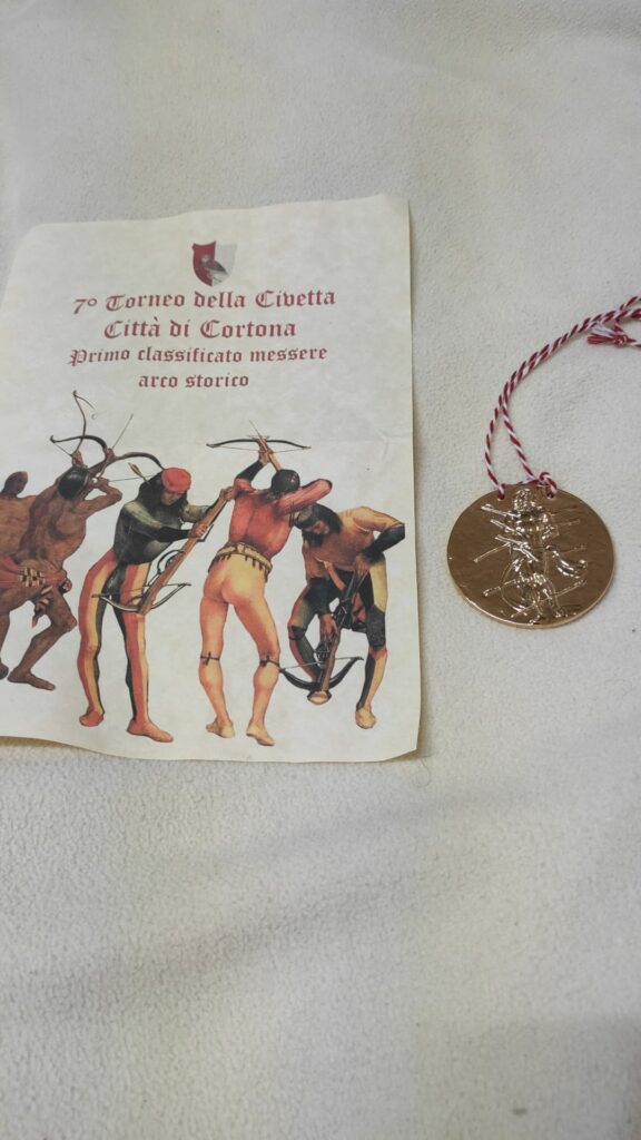 Domenica scorsa 8 ottobre,si è svolta a Cortona la penultima tappa di Campionato Nazionale Lam, in un giorno di festa per la Città ,che gode ancora di tanto turismo . Tutte le piazze e tutti i vicoli erano pieni di visitatori ,che si godevano il sole e fotografavano i nostri costumi medievali e i bersagli che erano situati anche dentro i musei, con lo stupore di noi concorrenti che abbiamo apprezzato moltissimo questa iniziativa .Tutta la gara si è svolta in scioltezza, filando veloce e tutti gli atleti hanno potuto godere dei 18 bersagli costruiti con arte e sicurezza . Il fine gara è stato accompagnato da un ottimo pranzo come tradizione Lam vuole, seguito nella piazza del Comune, da uno spettacolare gioco di bandiere ,tamburini e chiarine acclamato con un fortissimo applauso di gradimento . Passiamo alle premiazioni, svoltesi davanti ad un numerosissimo pubblico ,regalando così emozioni a tutti i concorrenti ,con il Grande Falco che per cominciare vince con la categoria più ambita e folta ,cioè quella dei Messeri Arco storico con il meraviglioso 1′ posto di Anselmi Patrizio . A seguire un ottimo 2′ posto nella categoria under 10 di Liberatori Lucio, che si prende tutto l’applauso della meravigliosa piazza .A seguire un ottimo 2′ posto nella categoria Dame foggia senza finestra di Schezzini Claudia ,che conferma ormai da tempo di stare nei posti più alti della classifica generale di Campionato Nazionale; per proseguire con un altro bel podio del 3′ posto della categoria under 17 foggia con finestra ,di Azzurra Licalzi . Ottimi piazzamenti nella categoria under 14 anche per Mazzi Tommaso a 2 punti dal terzo,di Fresta Claudio e di Nuccetelli Lorenzo.