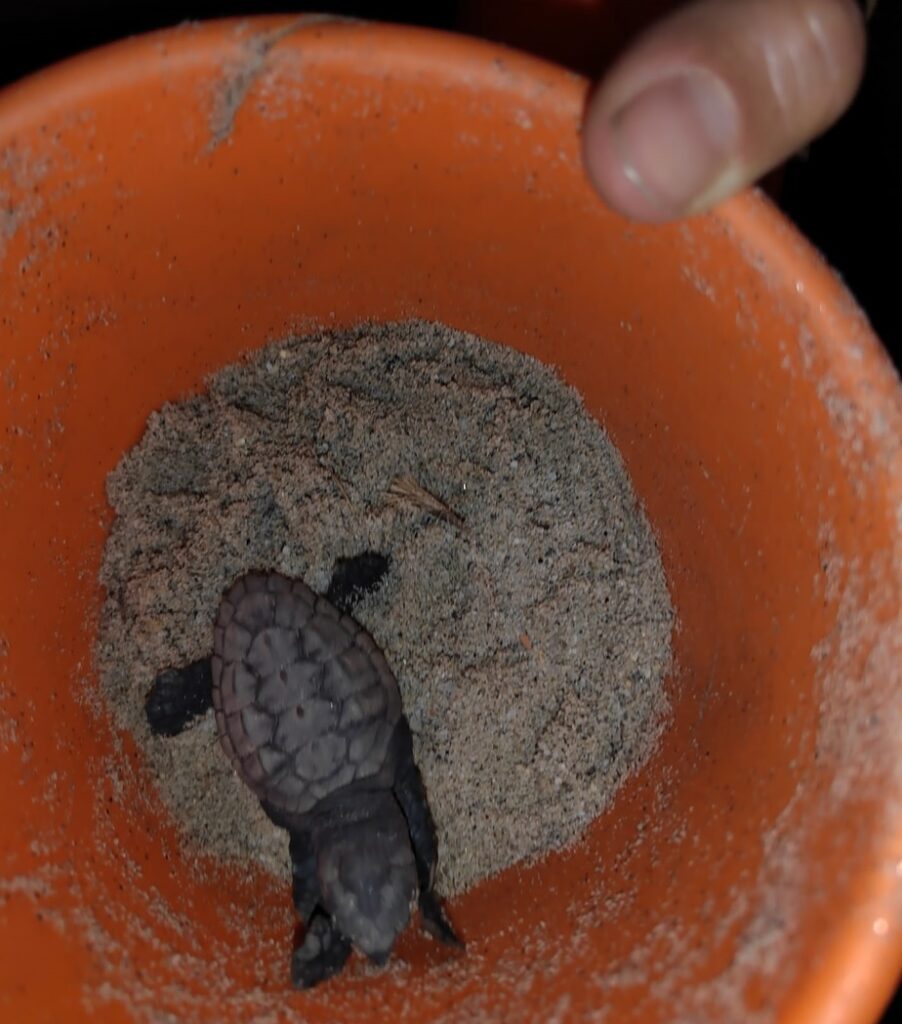 Un meccanismo collaborativo di intervento ben oliato e che ormai funziona alla perfezione, visto che dopo qualche minuto sono arrivate le volontarie di Legambiente Arcipelago Toscano che, nonostante l’oscurità, hanno individuato sulla sabbia le minuscole tracce della tartarughina maratoneta e, seguendole, sono arrivate proprio nell’area dove all’alba dell’8 agosto, una mamma tartaruga fece quella che venne considerata una deposizione fallita, perché – nonostante numerosi sondaggi – non si trovarono le uova.