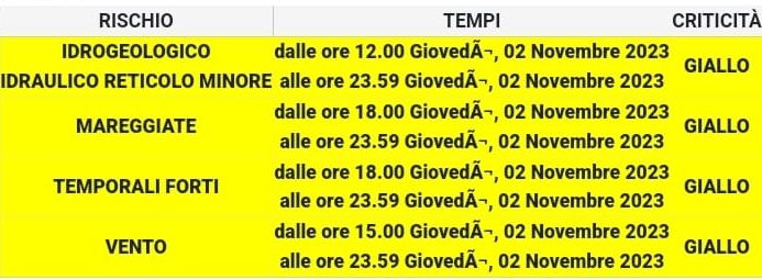 Un nuova allerta meteo, stavolta gialla, è stata diramata dalla Protezione Civile per la giornata di giovedi 2 novembre.