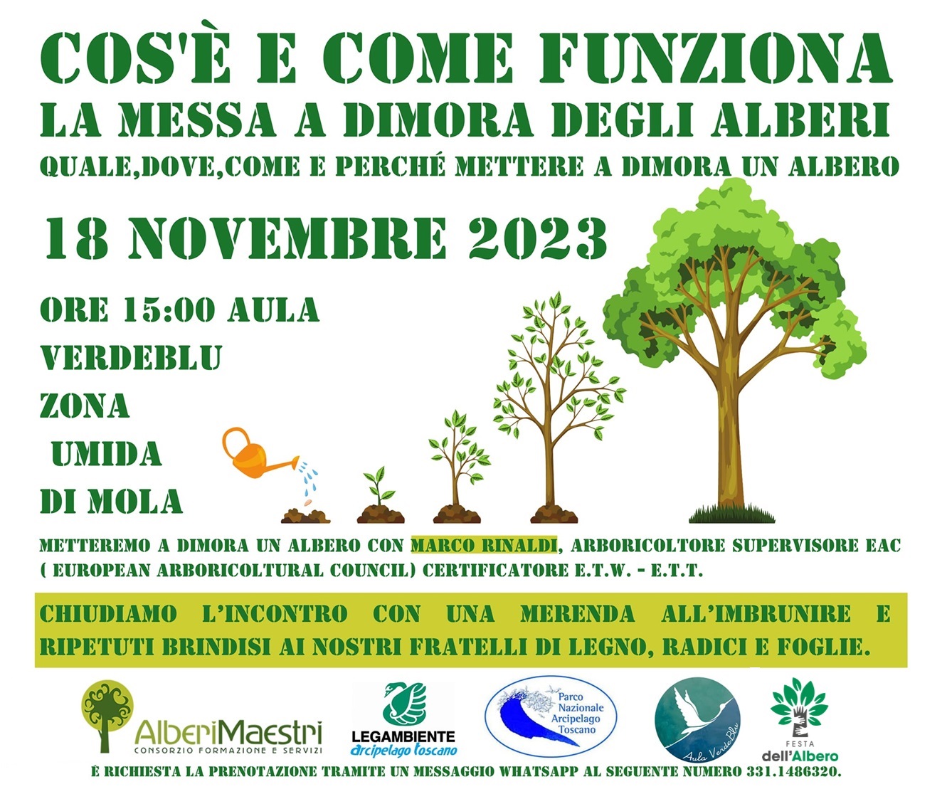 Il tema del primo argomento è “La messa a dimora degli alberi – Quale, dove, come e perché mettere a dimora un albero”, l’appuntamento è per venerdì 18 novembre 2023 alle ore 15:00 all’ Aula VerdeBlu nella Zona Umida di Mola (lato Capoliveri).
