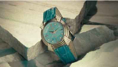 sua bellezza attraverso il fondello in cristallo colorato, che richiama le tonalità del quadrante. Il movimento si presenta con una lavorazione